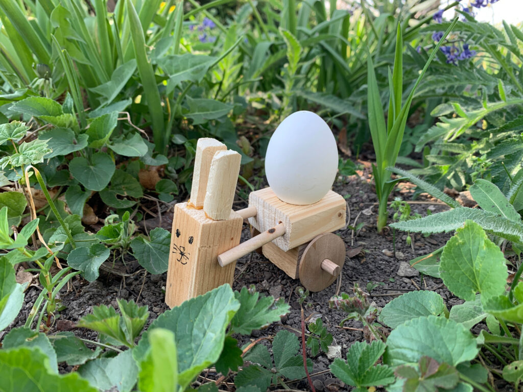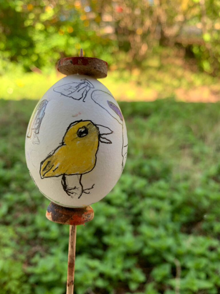 Wir helfen dem Osterhasen: bauen selbsterfundene Osterdekoration, auch für die Fenster, phantastische Eierhalter aus Holz und bemalen Eier – echt kunstvoll!